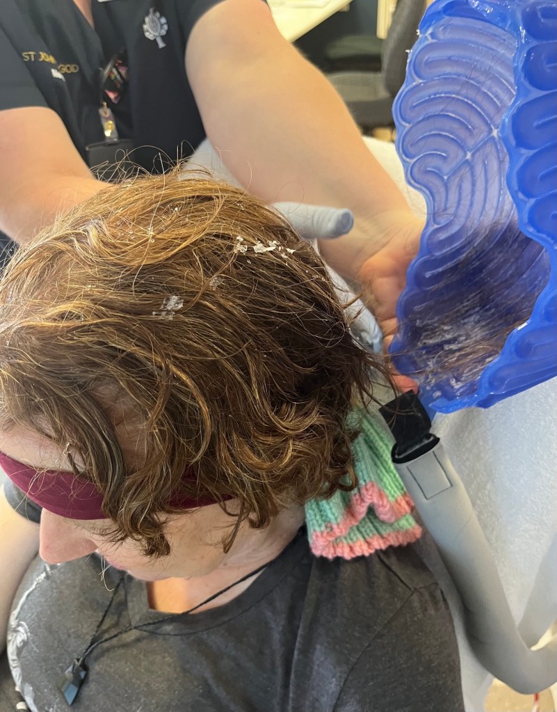 We did it again and what a difference. I realise now my hair was so thick at the first treatment, the cold cap didn’t feel that bad because I had a layer of insulation!! At this treatment it felt much colder (but I still coped fine). Hopefully this means a better result…… and I ended up with icicles!!