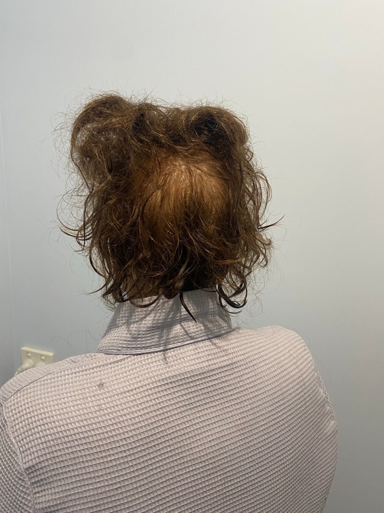 On Friday I awoke to a head of matted fluff masquerading as hair. I got in the shower hoping to give it a wash and make it look presentable. I wet it and it came out in clumps. It was 6:30am and I didn’t know what to do. I was too scared to shampoo, I was too scared to touch it. I drove to work in the rain with it dangling limply.
