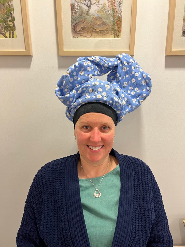 Sunday the sun came out to play and we enjoyed; a few quiet strolls, a visit from Mum, Dad, my sister and niece, Ice cream and a night out at the pub with friends. At the risk of standing out, I decided to jazz things up a bit for the dinners out, choosing more stylish headwear. I’ve even mastered how to do my wraps with no mirror!